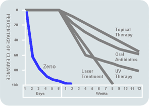 Acne lesion reduces in days with Zeno vs. weeks with other available treatment. CAUTION: This chart compares data from differing tests with widely varying protocols, hence data points are not directly comparable. This is only intended to be a general comparison.
